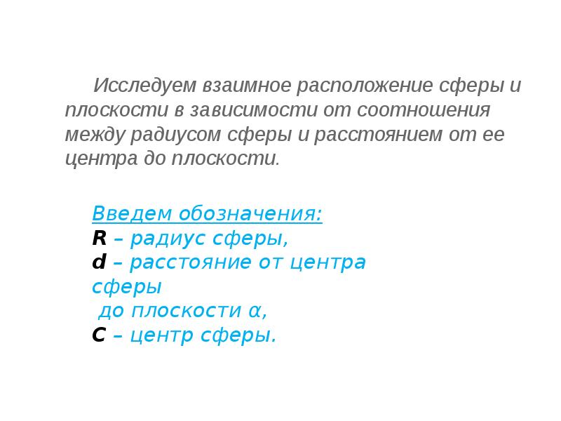 - 13. Подведение итогов 1)Рассмотрим возможные случаи взаимного расположения сферы и плоскости. Каковы