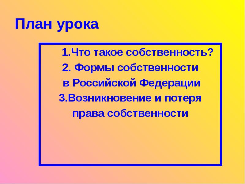 - 3. План урока 1.Что такое собственность? 2. Формы собственности в Российской
