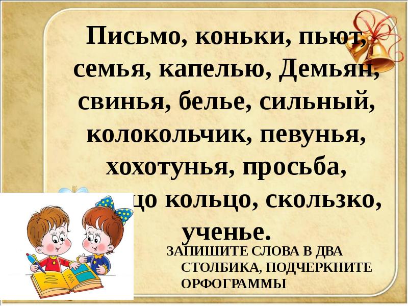 - 4. Проверка Пьют семья капелью Демьян свинья белье певунья хохотунья ученье