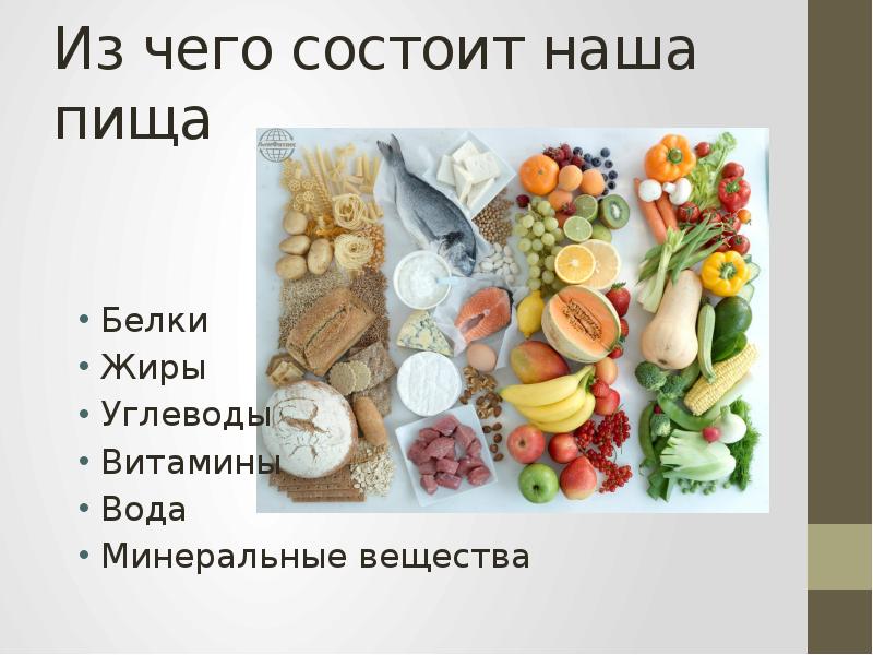 - 2. Из чего состоит наша пища Белки Жиры Углеводы Витамины Вода Минеральные