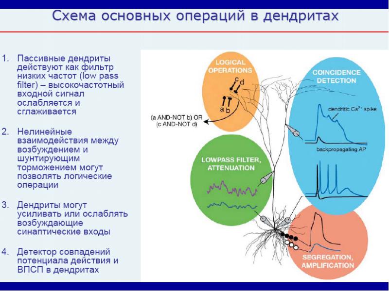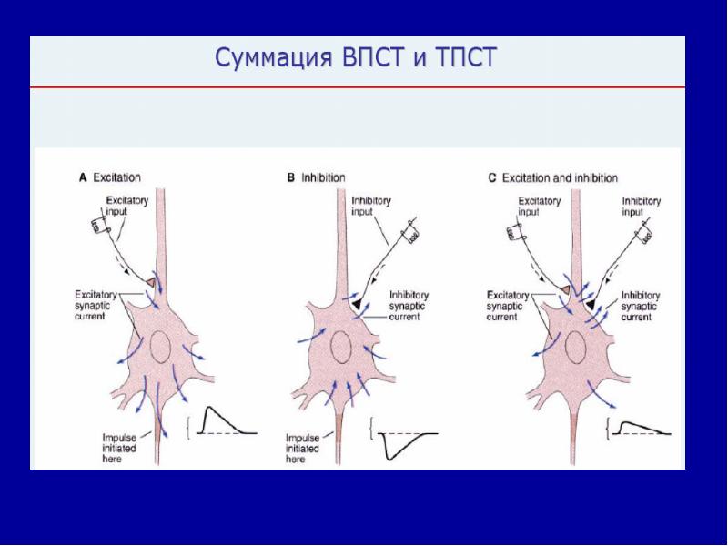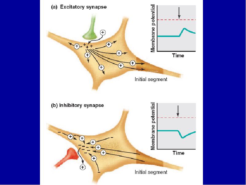 - 40. Нейроны интегрируют возбуждающие и тормозные влияния. Выходной сигнал определяется следующими механизмами: