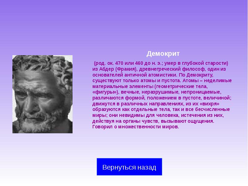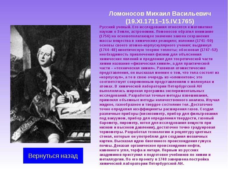 Менделеев Дмитрий Иванович (8.II.1834–2.II.1907 Русский ученый-энциклопедист. Ранние научные работы посвящены изучению изоморфизма и удельным объемам (1854–56). Открыл (1860) «температуру абсолютного кипения жидкостей». Автор фундаментального труда «Основы химии», выдержавшего при жизни Д. И. Менделеева восемь изданий. В ходе работ над первым изданием пришел к идее о периодической зависимости свойств химических элементов от их атомных весов. В 1869–1871 изложил основы учения о периодичности, открыл периодический закон и разработал периодическую систему химических элементов. На основе системы впервые предсказал (1870) существование и свойства нескольких не открытых еще элементов, в том числе «экаалюминия» – галлия (открыт в 1875), «экабора» – скандия (1879), «экасилиция» – германия (1886). Осуществил фундаментальный цикл работ по изучению растворов, разработав гидратную теорию растворов. Создал (1873) новую метрическую систему измерения температуры. Нашел (1874) общее уравнение состояния идеального газа, обобщив уравнение Клапейрона (уравнение Клапейрона–Менделеева).
