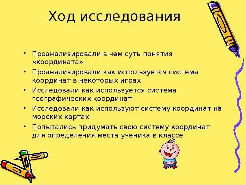 - 4. Ход исследования Проанализировали в чем суть понятия «координата» Проанализировали