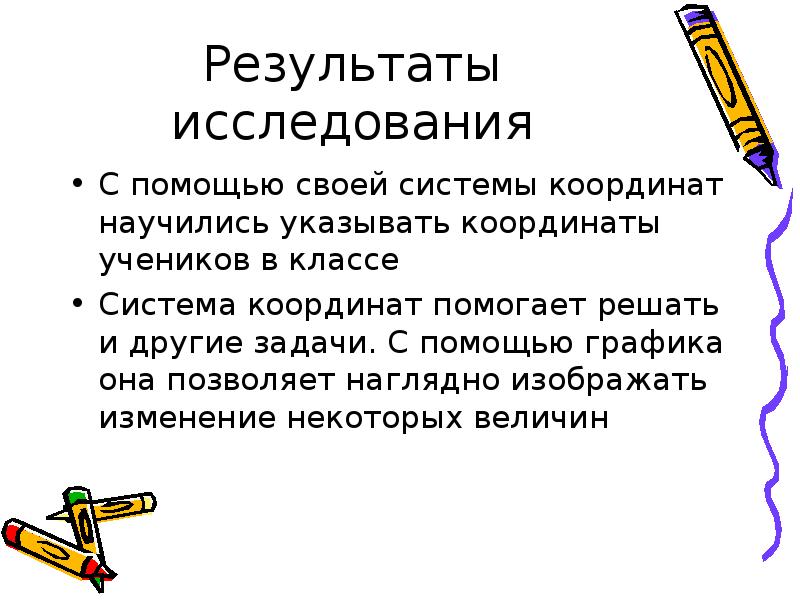 - 7. Результаты исследования С помощью своей системы координат научились указывать координаты учеников