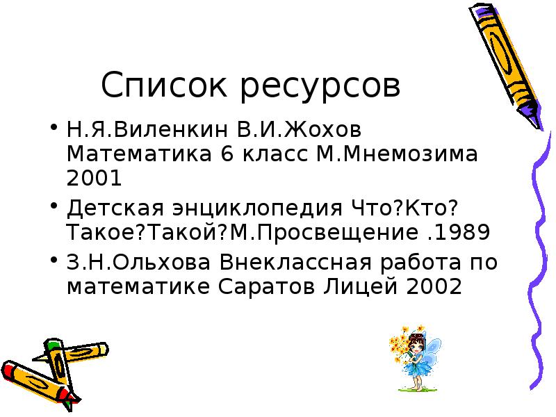 - 9. Список ресурсов Н.Я.Виленкин В.И.Жохов Математика 6 класс М.Мнемозима 2001 Детская энциклопедия