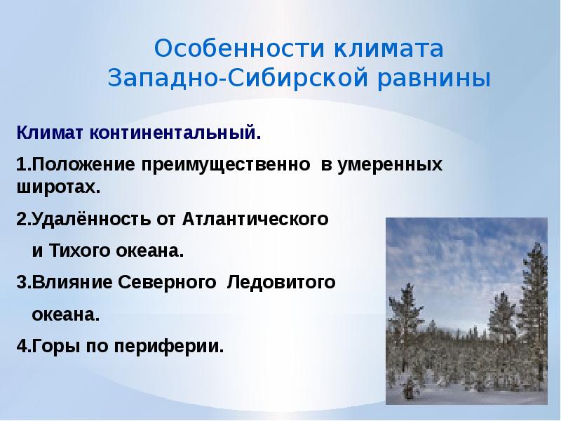 - 12. Климат Западной Сибири Север территории расположен в арктическом и субарктическом поясе.